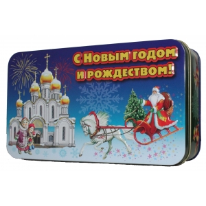Описание: Новогодний ларец "Дед Мороз" содержит подарочный набор чая: чай "Аристократ" - черный индийский чай, крупный лист 100 г., "Земляничный трюфель" - зеленый цейлонский чай, крупный лист, ароматизирован маслом лимона, 100 г. "Яблоко с корицей" - черный индийский ароматизированный чай, крупный лист 100 г. Упакован в жестяную подарочную банку в виде ларца с замочком.